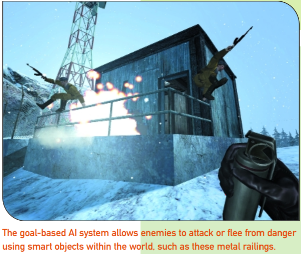 The key to these systems is their unscripted nature. An NPC may start off working at a desk with a typewriter, get up and head over to the vending machine for a can of soda, step outside for a cigarette break, lean against a wall, walk over to a window to admire the view, and even run off to the restroom for a potty break. To ensure that players would be able to observe these behaviors, we effected a system that let us designate hiding places in levels from which you can watch enemies without being seen. Our implementation left something to be desired, but it still served the purpose of making stealth easier.