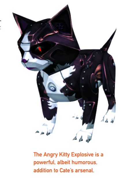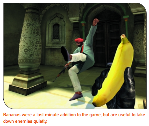 Other issues were easier to address. NOLF had included roughly 30 weapons and gadgets, with a lot of overlap. For example, there were three pistols, two sniper rifles, several very similar missile-type weapons, and a couple of gadgets — such as the camera disabler and robotic poodle — that where rarely used. NOLF 2 has about the same number of items, but with a wider variety, including such devices as the Angry Kitty, banana, and bear trap, to compensate for the absence of the redundant firearms.