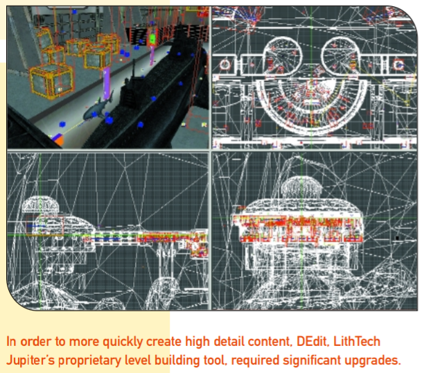 Other important improvements included robust exporters for 3DS Max and Maya, which let us build and texture geometry in professional 3D packages and import it into our proprietary editor, where we added gameplay. Rather than enumerate every improvement, I’ll just say that the decision to focus on upgrading our tools not only saved us immense frustration but also led to significantly higher quality content than we would have been able to produce otherwise.
