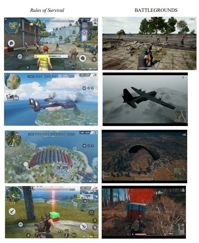 The studio claimed NetEase had “committed unlawful, unfair, an/or fraudulent business acts by copying PUBG’s Battlegrounds game in each version of their Rules of Survival and Knives Out games,” and highlighted the alleged infringements in the side-by-side comparisons included below.