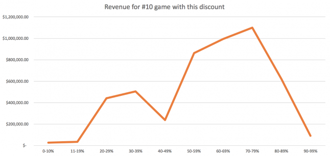 To illustrate his point, Galyonkin dug into the data and pulled out the revenue figures for the #10 best-selling game at each discount percentage. The swath running from 50 to 79 percent was most profitable. We’ve reproduced his graph below.