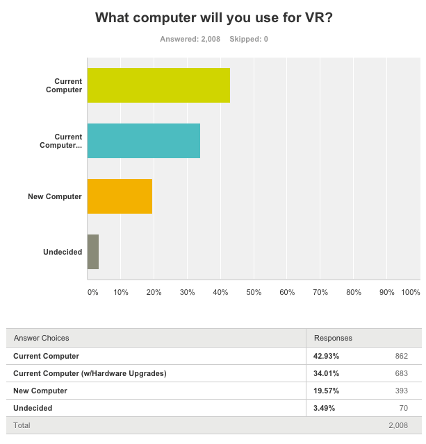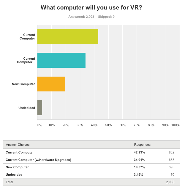 Valve disseminated its survey chiefly through Steam’s SteamVR forum and thus the respondents likely skewed towards VR enthusiasts who use their PC as a primary entertainment platform. Still, the majority (~42 percent) said they had no plans to upgrade their PC for VR experiences.